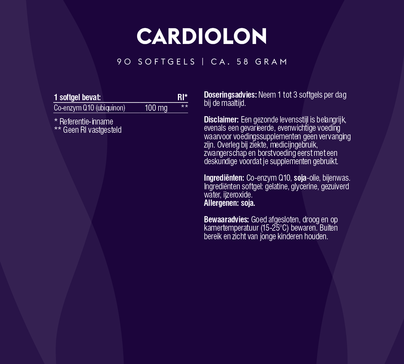 Cardiolon-100 is een krachtig supplement met 100 mg co-enzym Q10. Normaliter maakt ons lichaam Q10 zelf aan. We treffen deze stof het meeste aan in organen en weefsels die veel energie nodig hebben. Q10 zit in elke cel (specifiek in de mitochondriën) en is een belangrijke cofactor voor de celademhaling. Ook is het een antioxidant en radicaalvanger. Rokers en mensen die statines (cholesterolverlagers) slikken, hebben sowieso behoefte aan meer Q10. Rokers, omdat het roken van sigaretten het lichaam uitput van co-enzym Q10 (vandaar dat rokers over het algemeen minder energie hebben). En statinegebruikers die de bekende bijwerking 'pijn in de spieren' ervaren. Ook zijn er positieve ervaringen met Q10 bij mensen met hartfalen.